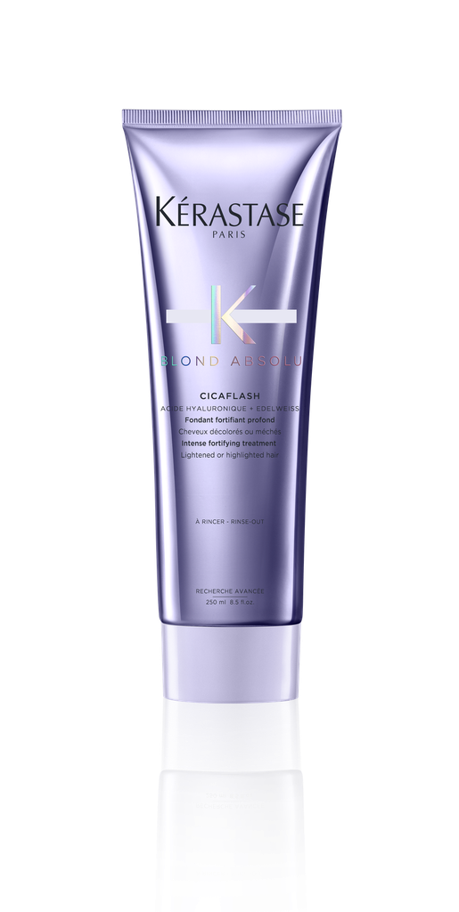Le Fondant Cicaflash Blond Absolu de Kérastase est un après-shampooing à la texture crémeuse couleur lavande qui répare profondément les cheveux blonds sensibilisés par les mèches ou la décoloration. Une super dose de soin avec le pouvoir réparateur intense d'un masque et la légèreté d'un après-shampooing. Enrichi d'une association puissante d'acide hyaluronique et de fleur d'Edelweiss, le Bain Ultra-Violet Blond Absolu de Kérastase nourrit profondément la fibre pour illuminer le blond. L'acide hyaluronique remplit et cicatrise les dommages de la fibre de l'intérieur pour une cuticule uniforme et profondément nourrie. Cet acide ultra concentré renforce les cheveux et prévient la casse future. La fleur d'edelweiss est riche en antioxydants pour protéger les cheveux contre les dommages quotidiens. Elle adoucit et apaise également la fibre capillaire sensibilisée. Idéal pour toutes les nuances de blond, du blond méché au blond polaire en passant par le blond californien, l'après-shampooing Blond Absolu Cicaflash de Kérastase renforce le cheveu et prévient l'érosion et la casse de la fibre. Les cheveux sont doux, nourris sans être alourdis.